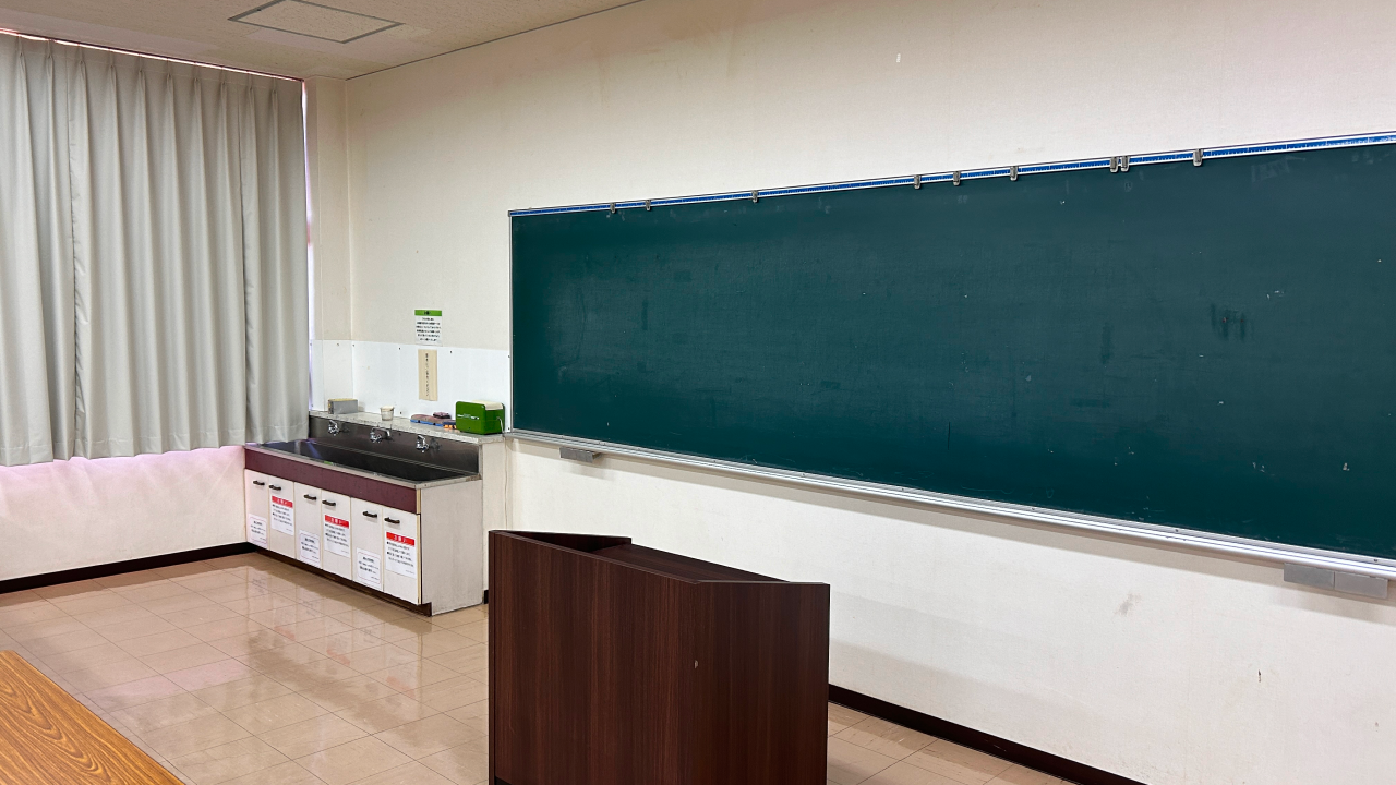第2研修室は50名程度の人数が集まる会議や研修に最適なお部屋で、講演卓と黒板が完備されていて学校の教室のようなお部屋です。水場がありますので書道など水が必要な行事に重宝されてます。